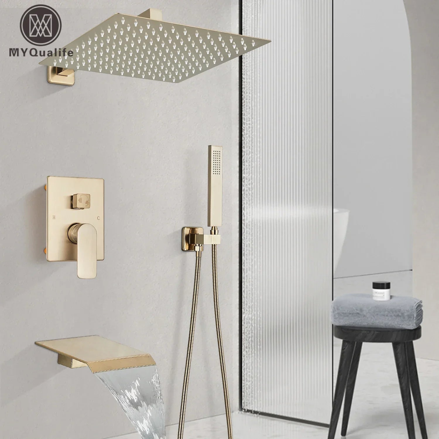 DecorBites™ Brushed Gold Shower Faucet Set 2/3 Way Rainfall Bathtub Mixer Wall Mounted Box