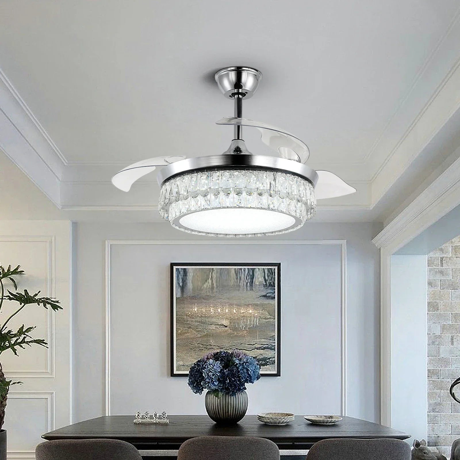 DecorBites™ Crystal Fan Chandelier LED Light Retractable Blades Dimmable Remote Modern Home Decor
