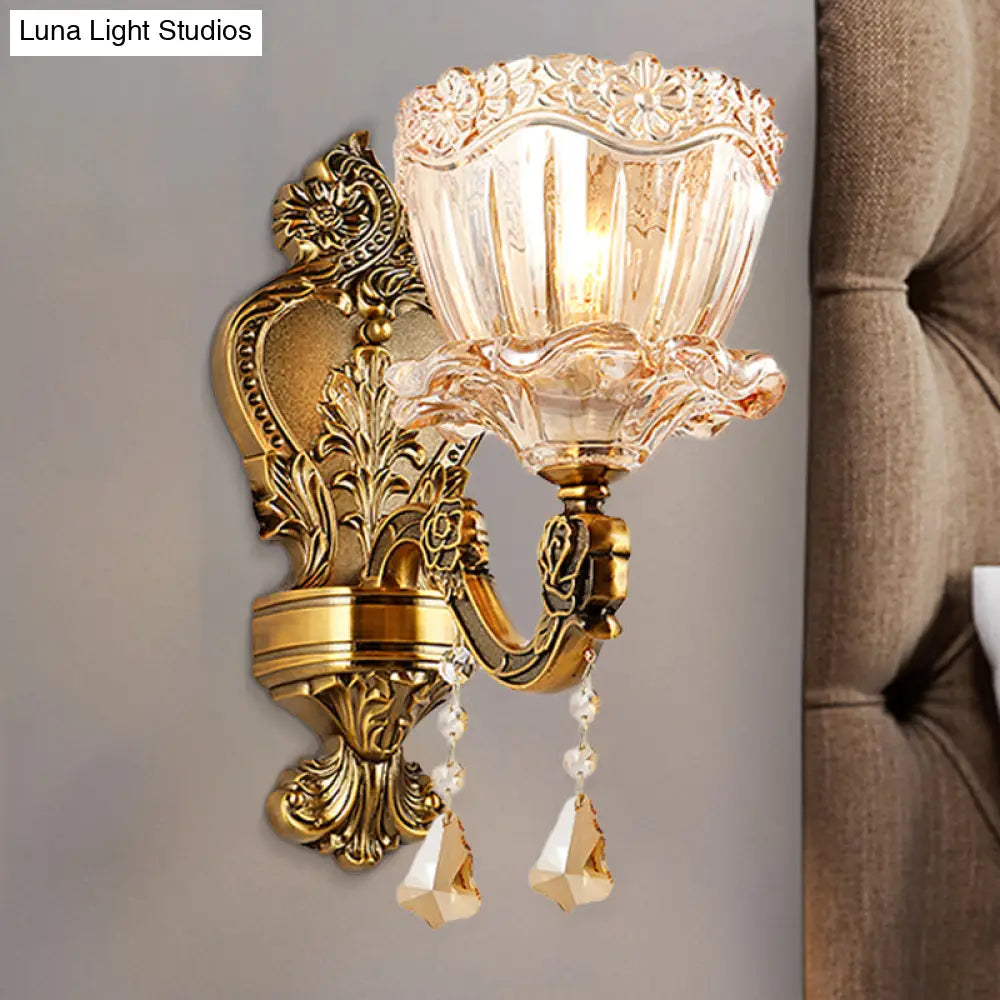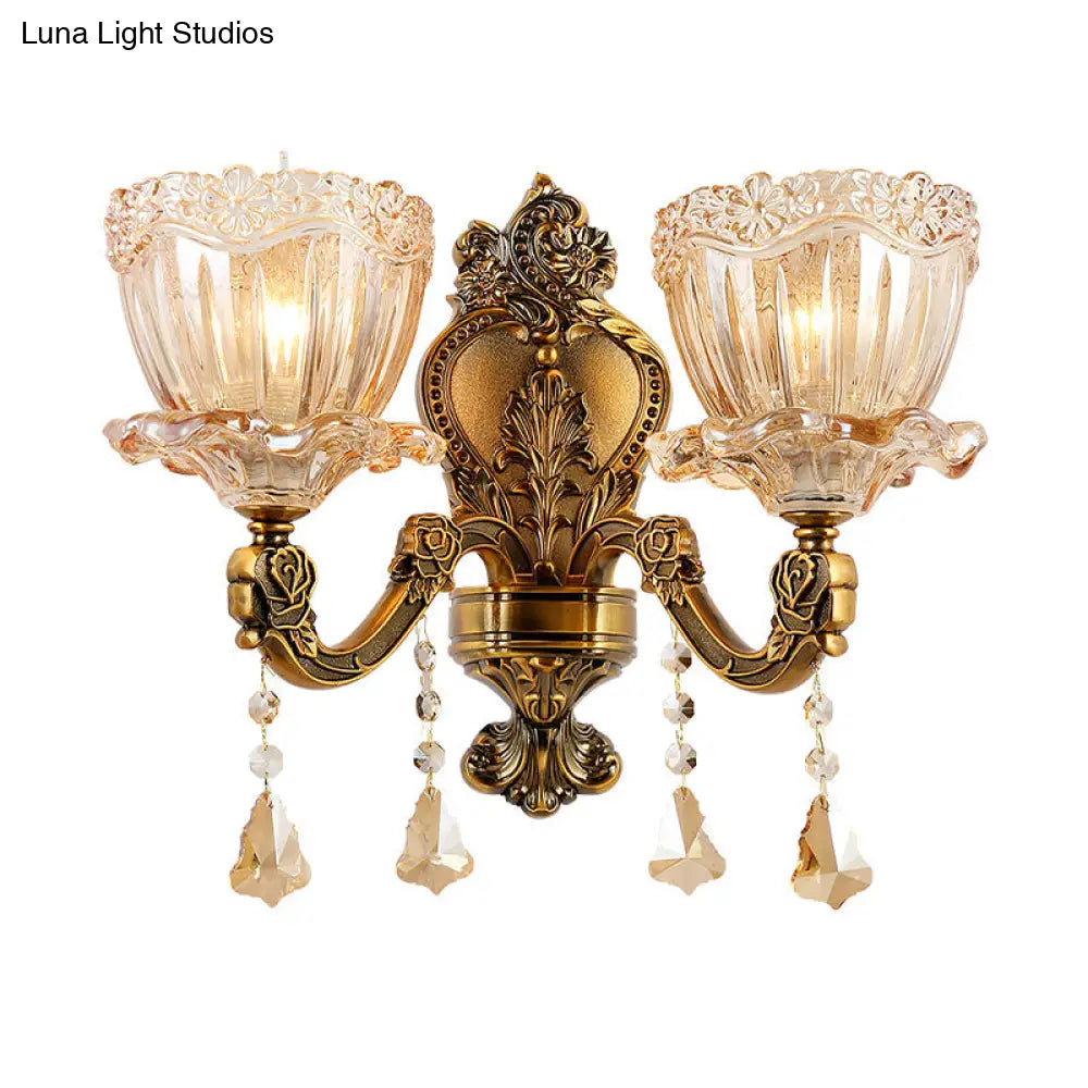 DecorBites™ DecorBites™ Modern Amber Glass Flower Wall Light Fixture 1/2 Head Brass Sconce with K9 Crystal Drop
