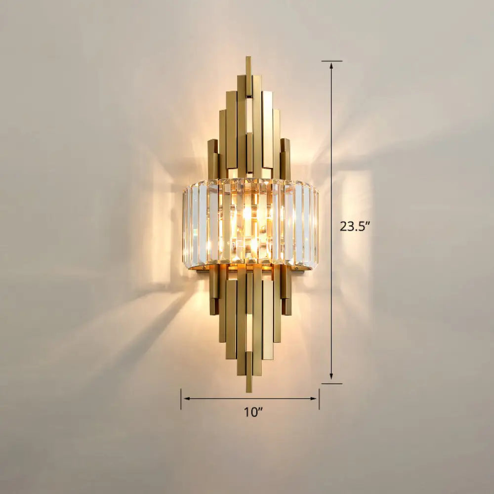 The product dimensions are 5-9 inch in height, 10-14 inch in width. It takes a voltage of 110v-120v or 220v-240v. It has 2 or 3 lights. It is made of metal. It is for indoor use only. The shade material is crystal. The product is a wall lamp. The product has a post-modern gold finish. The product is a square plate, semicircle, arc, round, circle, prismatic, long column, novelty, cone, or long cone.