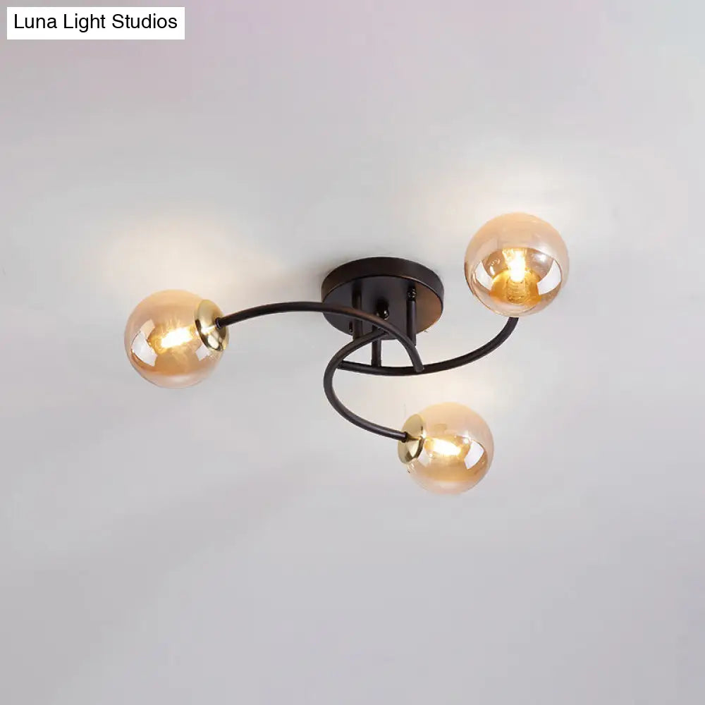 This ceiling light will fit in any modern or contemporary design space. It features a black and gold finish on metal material, and comes with various shades of cognac, milk white, clear, smoke grey, and other colors. The swirled design of the metal creates a unique look, and when matched with the glass shade, this ceiling lamp will immediately become a focal point in your home. It is also offered with 3 or 5 lights for an adjustable amount of illumination. Perfect for making your room look modern and stylish, this Swirled Metal Semi Flush Light Post-Modern Close to Ceiling Light with Ball Glass Shade is an ideal addition to any home.