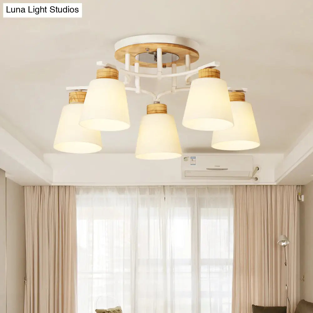 This attractive adjustable ceiling light features either three or five heads which adds visual interest while also providing enough illumination. The light is relatively easy to install and can be set up in no time. The White-Wood Barrel Semi Flush Mounted Light Modernism 3/5 Heads Cream Glass Close to Ceiling Lamp will be a perfect addition to any modern style home. With its adjustable size and number of lights, it is sure to be a great conversation piece in your home while also providing excellent lighting.