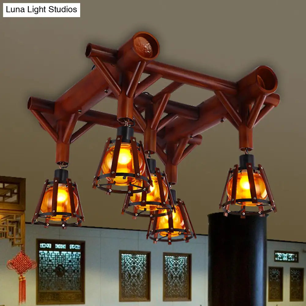 DecorBites™ DecorBites™ Semi Flush Mount Conical Cage Wood Ceiling Light Fixture - 5 Heads, Country Style, in Brown