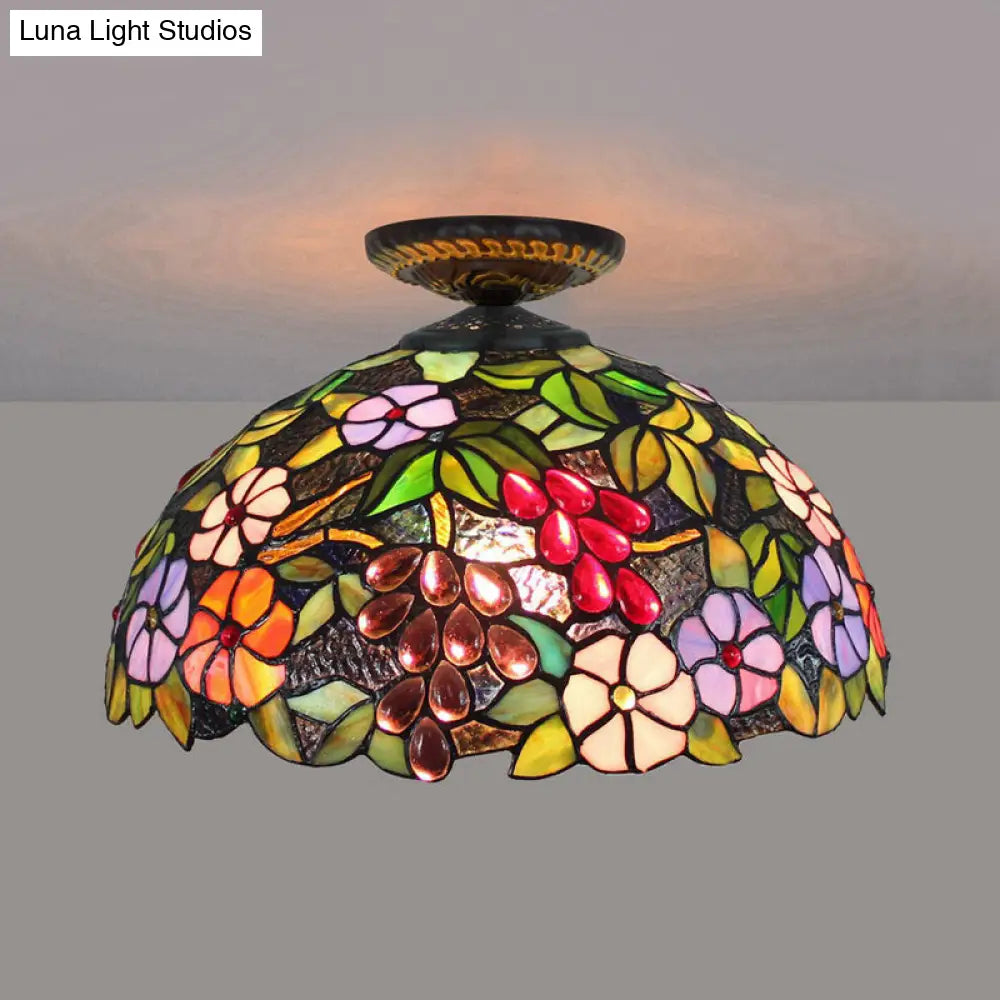 DecorBites™ DecorBites™ Tiffany 1-Light Stained Glass Blossom Ceiling Lamp- Brass Flushmount, 12"/16" Width