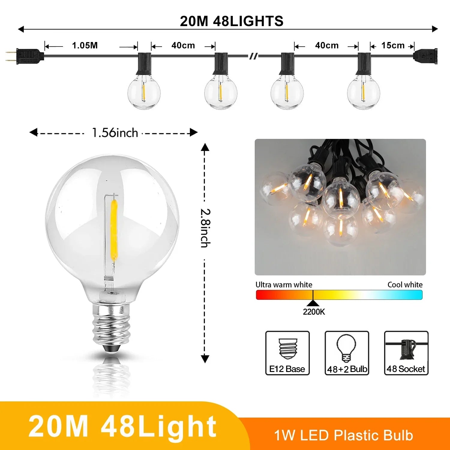Available in various lengths including 25ft, 33ft, 50ft, and 65ft, these string lights feature soft warm white 2200K color temperature for a cozy ambiance. Each bulb is shatterproof and made of plastic LED material, ensuring long-lasting performance.