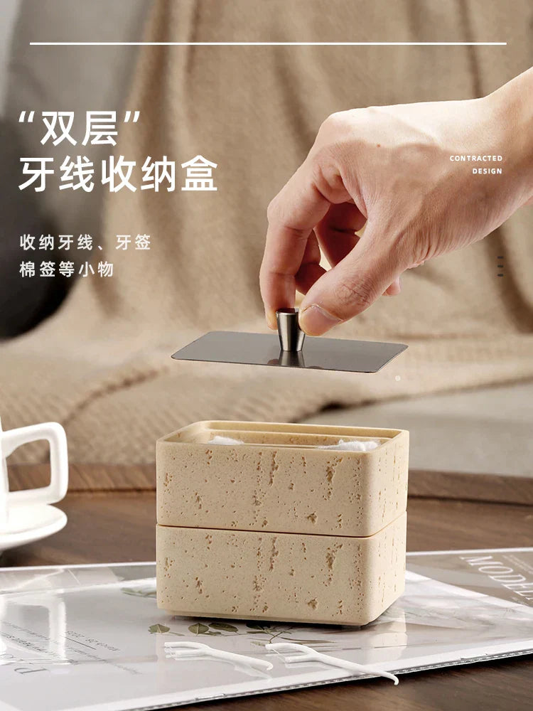 Introducing the Double Decker Jewelry Organizer with Natural Stone, a versatile 2 in 1 Floss Box & Bathroom Ornament that adds a touch of elegance to your space.