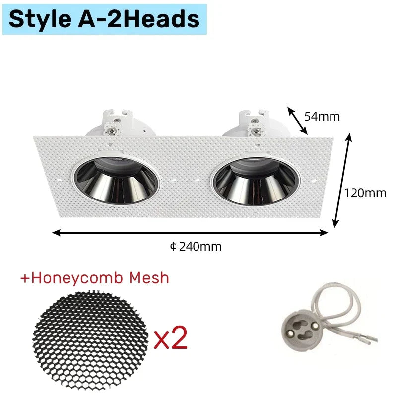 Introducing the Double Head Square LED Downlight Mounting Frame for GU10/MR16 Spotlights, a sleek and modern lighting solution for your space.