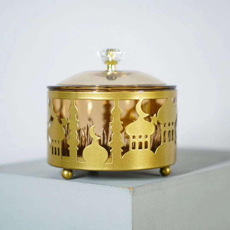 Elevate your dining table with the exquisite Eid Mubarak Metal Fruit Snack Tray: Castle Tea Tray with Lid, a must-have addition for any host or hostess looking to impress their guests. Add a touch of sophistication to your gatherings and make a lasting impression with this stunning piece that combines practicality with timeless beauty.
