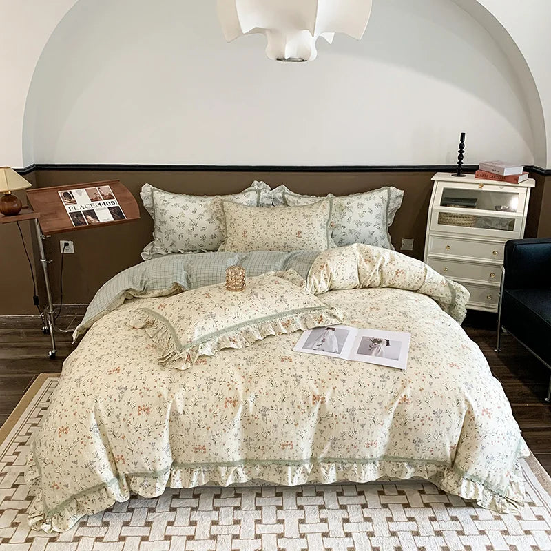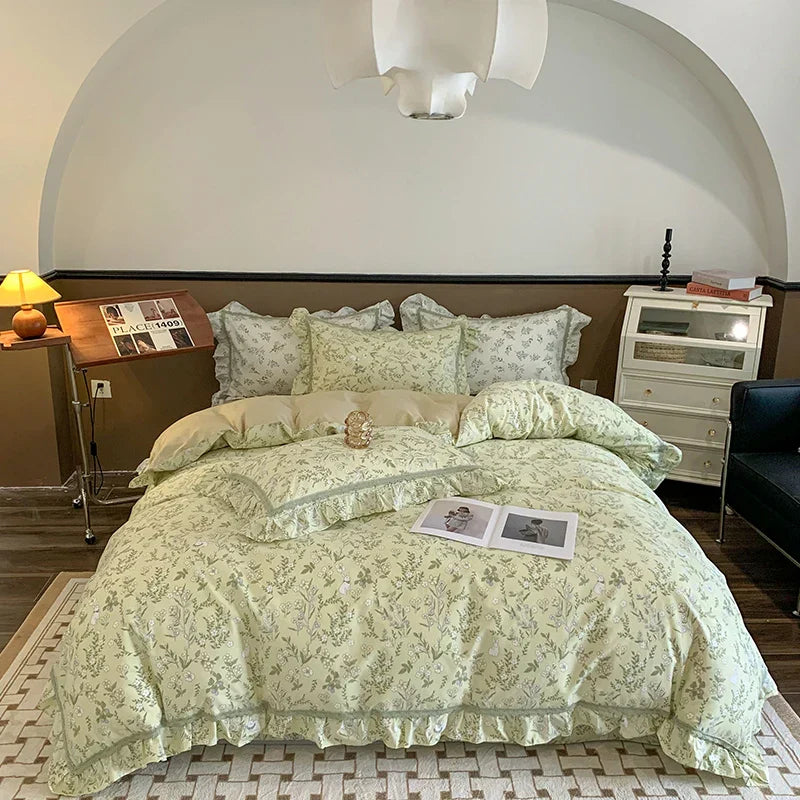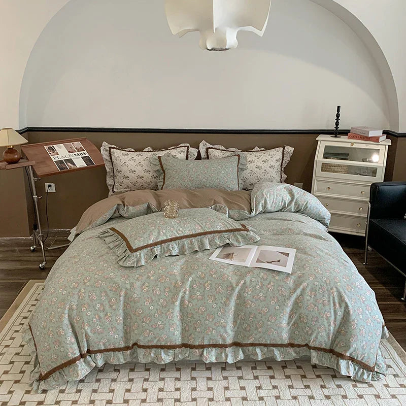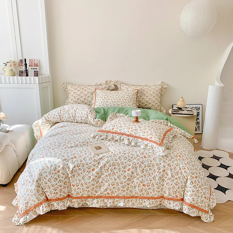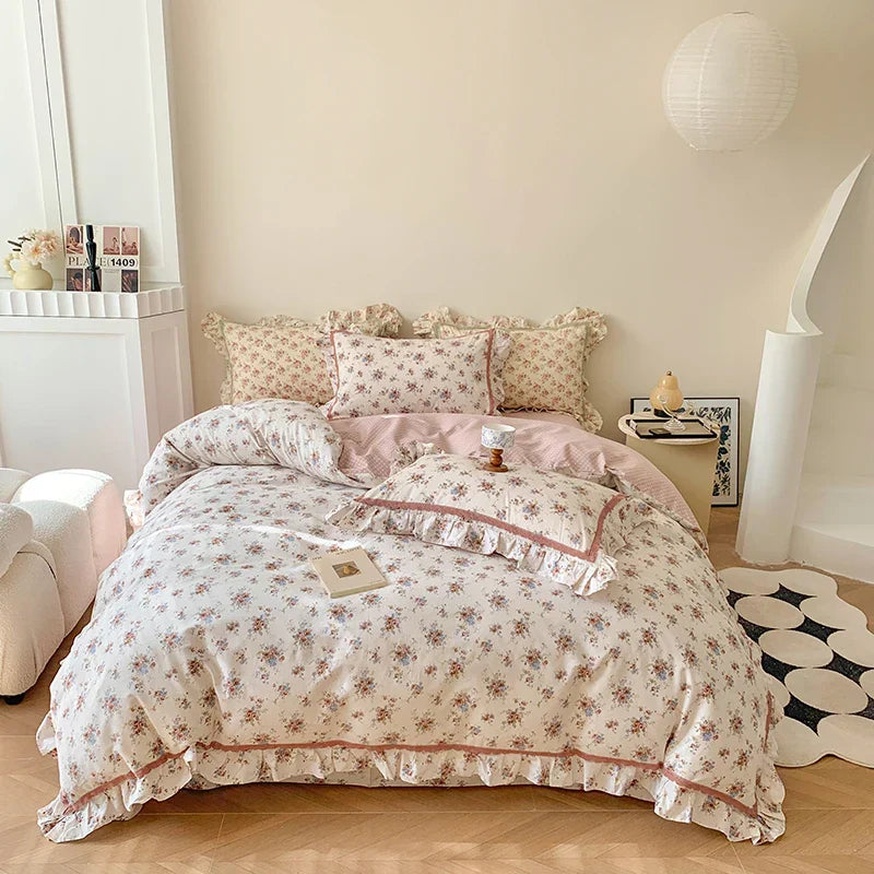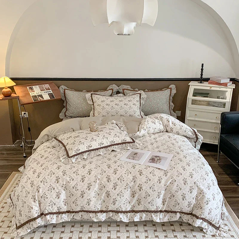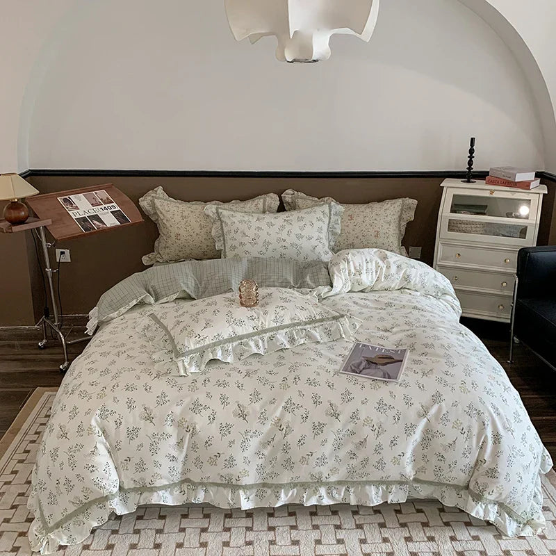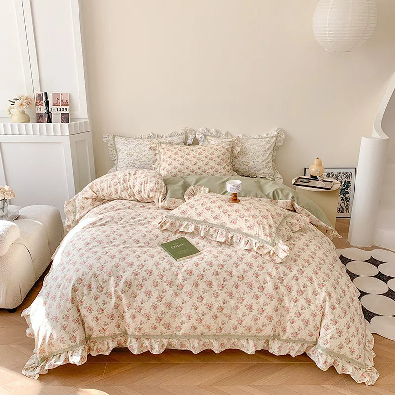 DecorBites™ French Floral Bedding Set, 100% Cotton, Ruffles, Duvet Cover, Bed Sheet, Pillowcases