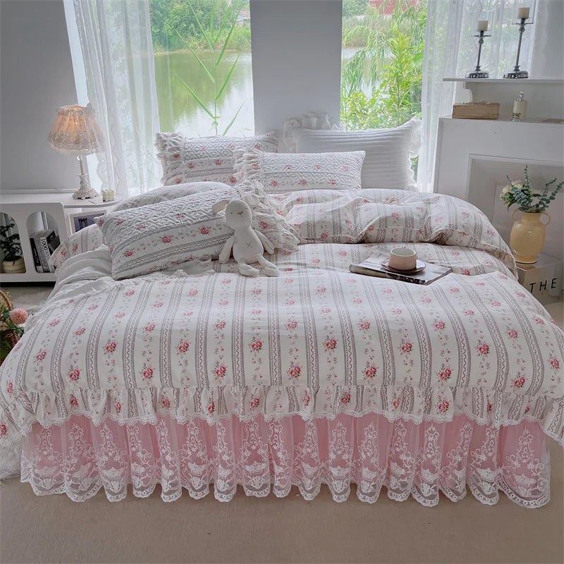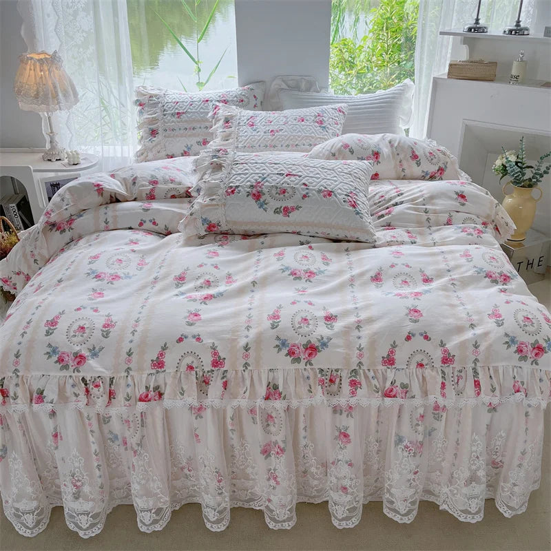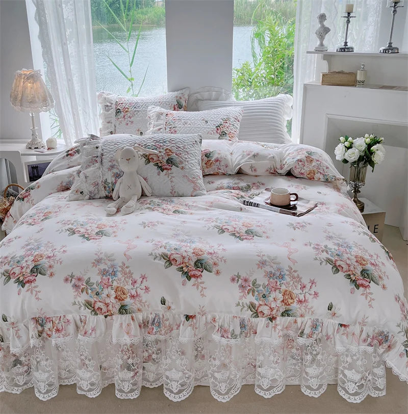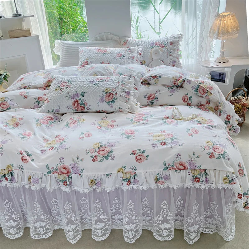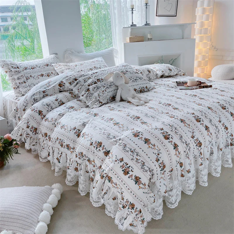 DecorBites™ French Floral Print Bedding Set: Duvet Cover, Lace Ruffles, Quilted Embroidery, Pillowcases