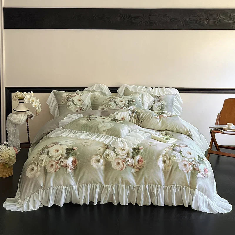 DecorBites™ French Flowers Lace Ruffles Bedding Set: Soft Silky Ice Silk for Single Queen King