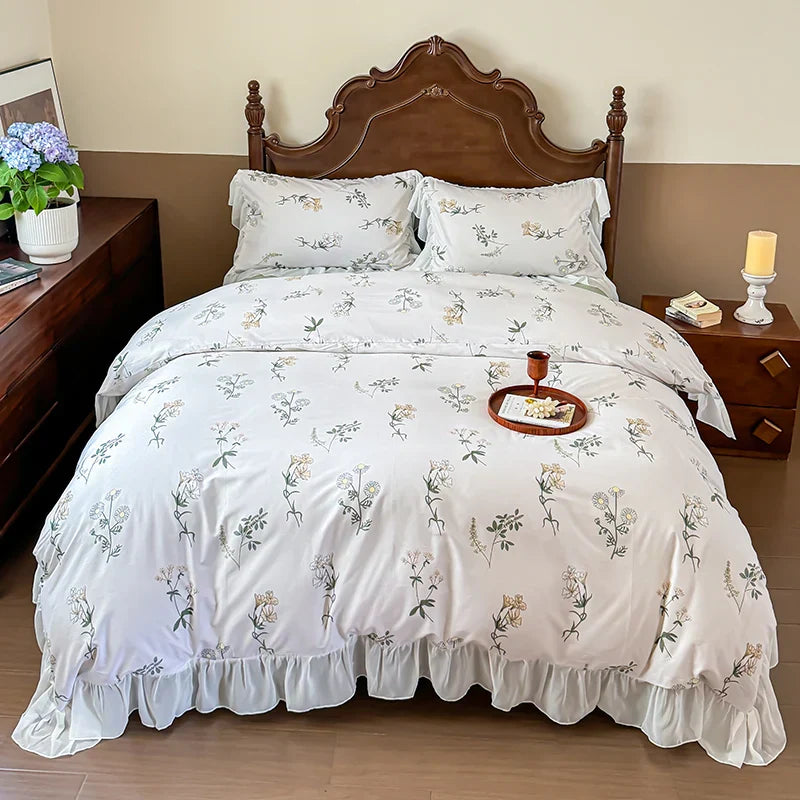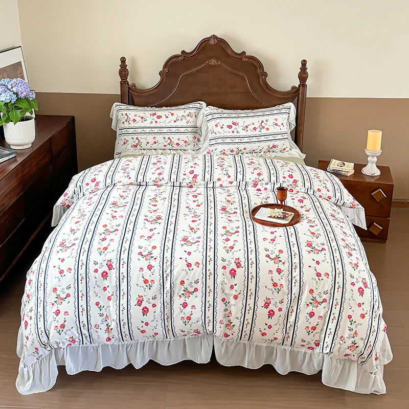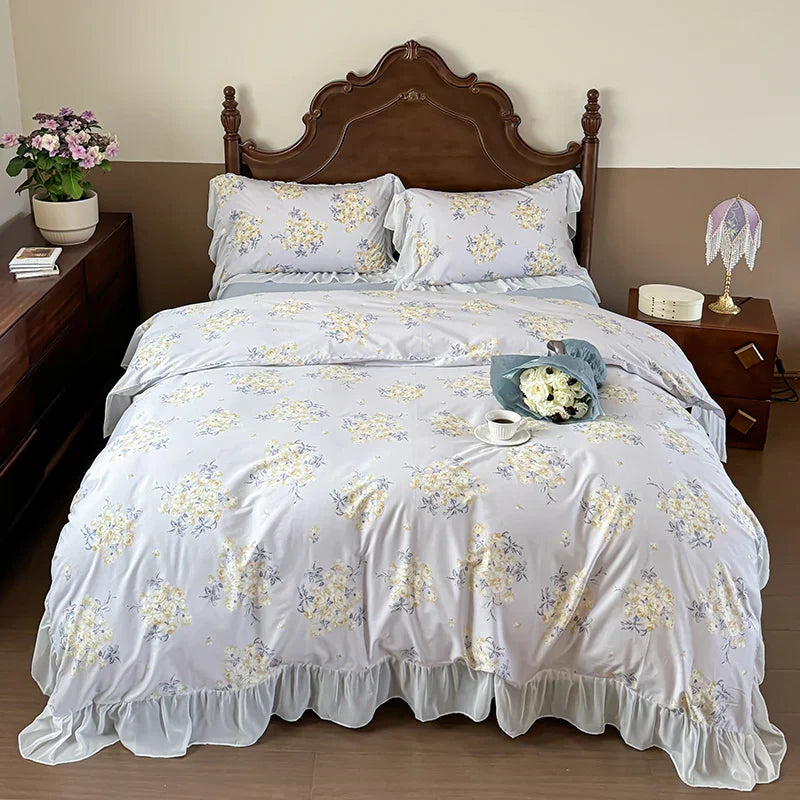 DecorBites™ French Flowers Lace Ruffles Princess Bedding Set with Bed Sheet Pillowcases