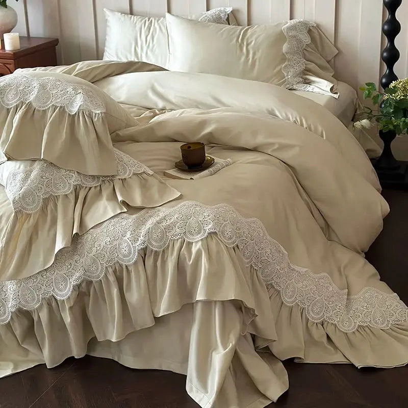 DecorBites™ French Lace Ruffle Princess Wedding Bedding Set with Brushed Duvet Cover & 2 Pillowcases