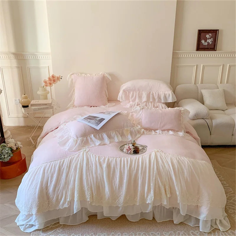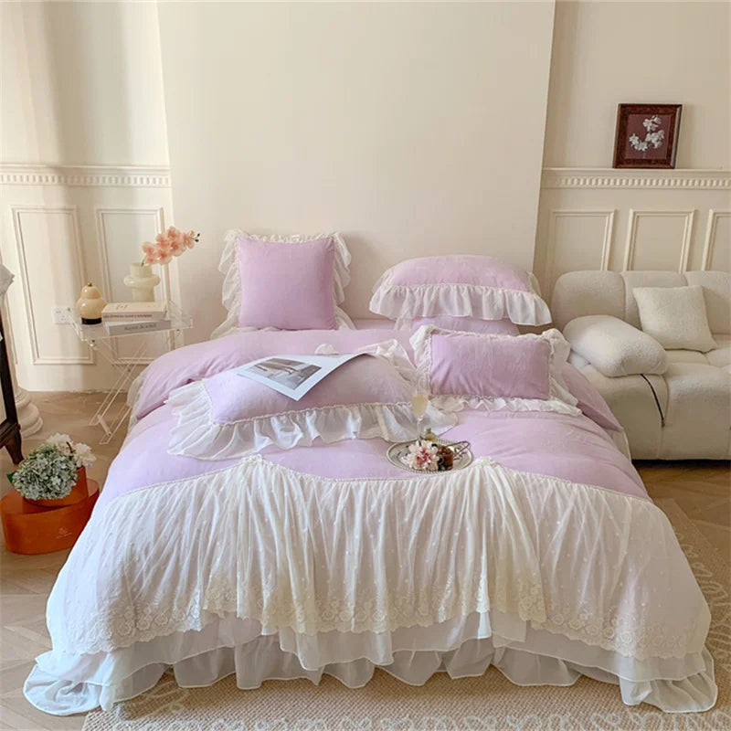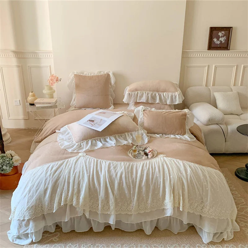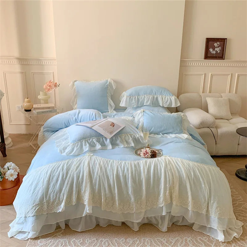 DecorBites™ French Princess Velvet Bedding Set, Queen Size with Lace Ruffles