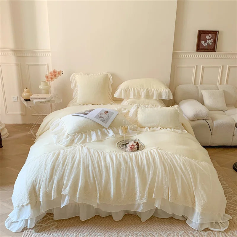 Indulge in the luxurious elegance of the Decorbites French Princess Velvet Bedding Set, fit for a queen. This exquisite bedding ensemble is crafted with meticulous attention to detail, featuring delicate lace ruffles and intricate embroidered accents that add a touch of romance to your bedroom decor.
