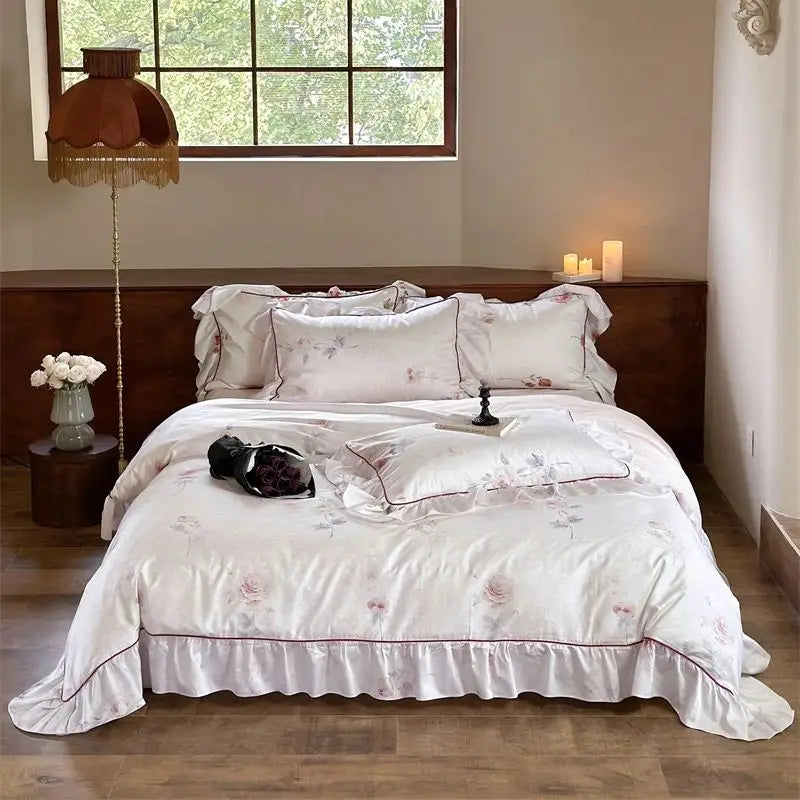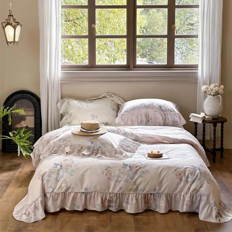 DecorBites™ French Rose Flowers Print Bedding Set, Elegant Ruffles Princess Collection