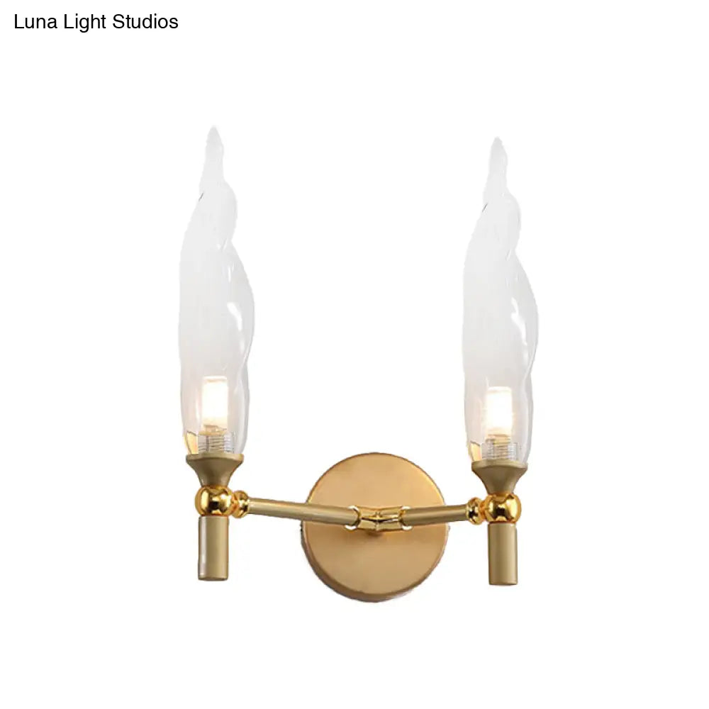It is ideal for giving your living room a modern and stylish look. Featuring a two-arm wall sconce, this lighting fixture will add a touch of industrial-inspired charm to your home. The gold-finished metal frame adds a hint of industrial elegance and is combined with a frosted and clear torch glass shade. This modern wall sconce provides a soft and warm light and fits standard bulbs up to 14 inches long. It is powered by direct wired electric, in a voltage of both 220V-240V and 110V-120V, with a G9 bulb base. The fixture size is 11.5” high, with a fixture width of 12”. This light is able to accommodate up to two bulbs, and is compatible with LED lamps, incandescent lamps, and fluorescent bulbs. With its modern style and glass shade, this wall sconce adds sophistication to any area of your home. Whether you're placing it in your bedroom, living room, entryway, or hallway, you'll love how this wall light adds character and ambiance to your space.