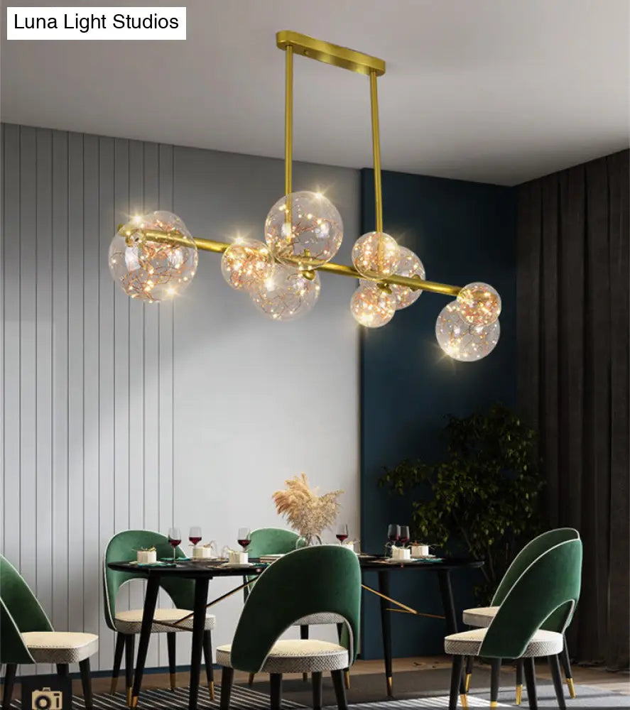 This stunning Mid-Century Gold Island Pendant Lighting Spherical Clear Glass Island Ceiling Light is the perfect addition to any dining room. Offering both modern styling and functionality, this fixture brings an eye-catching touch to your space. The size is greater than 25 inches, and the length is customizable in three sizes of 28, 40.5, and 46.5 inches. The fixture width is 12.5 inches, while the fixture height is 27.5 inches and includes a 19.5 inches chain/cord. Further, the number of lights can be specified in sizes of 6, 8, or 10 and is set in gold. The color temperature is third gear. Additionally, this light features a modern style, with a maximum bulb wattage of 40 to 59 Watts or 60 to 99 Watts. It is made of glass and shaped like a globe. The shade type is clear glass, and it is directed ambiently with a clear color shade. Finally, the voltage is 110V-120V or 220V-240V, with a bulb base of SMD and light type of LED/Incandescent/Fluorescent LED.