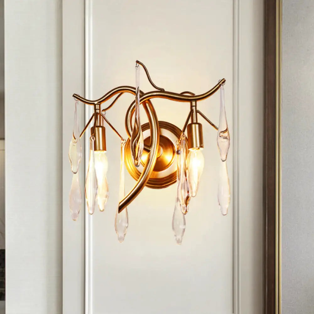 The Retro 2 Heads Wall Lighting Ideas Gold Raindrop Wall Mount Light with Crystal Drop Shade is an elegant lighting solution for any space. Offering both both classic and modern style, this wall light will add both prominence and sophistication to any room. The fixture is made of gold metal and crystal, with a base composed of E12/E14 bulbs, creating a beautiful illuminated effect.