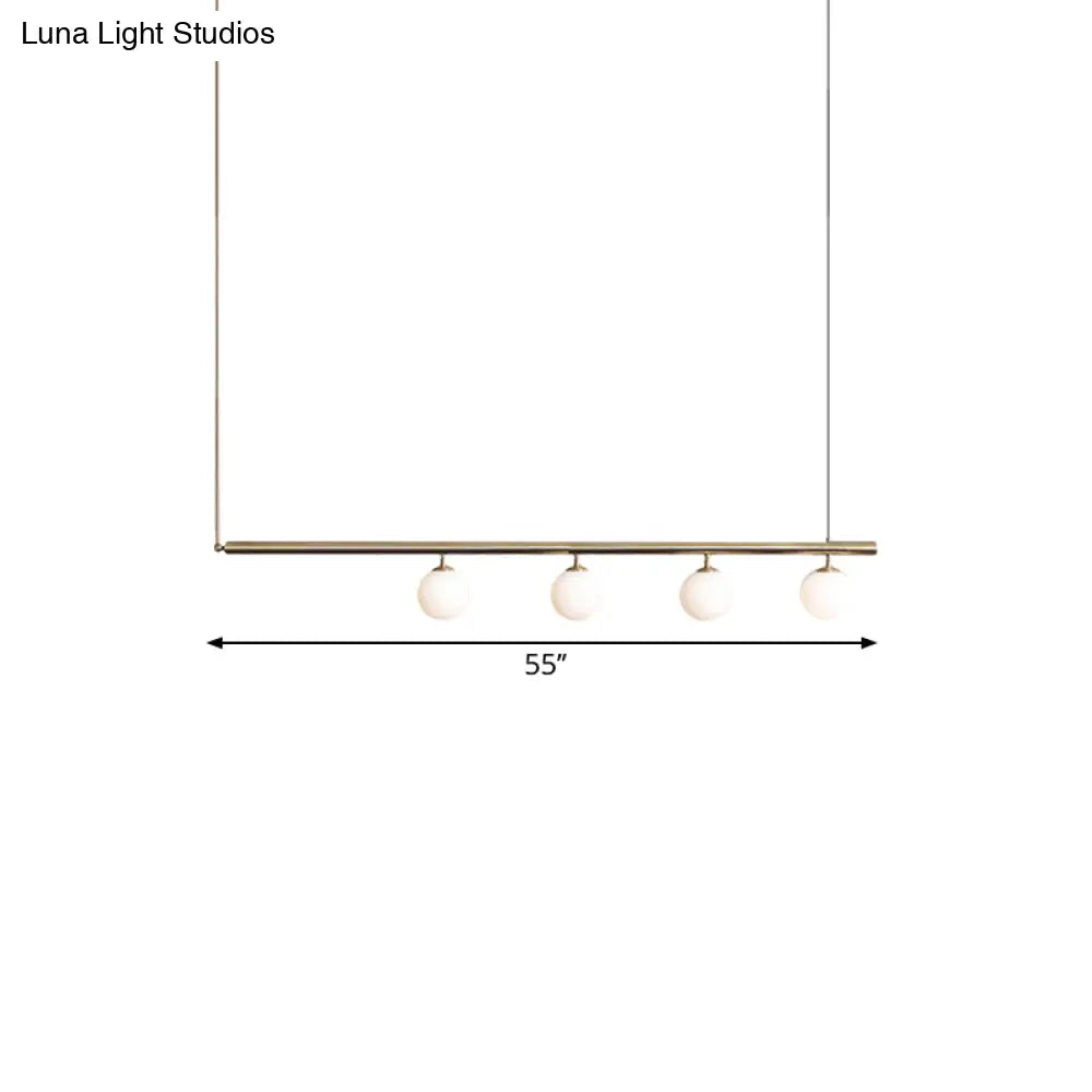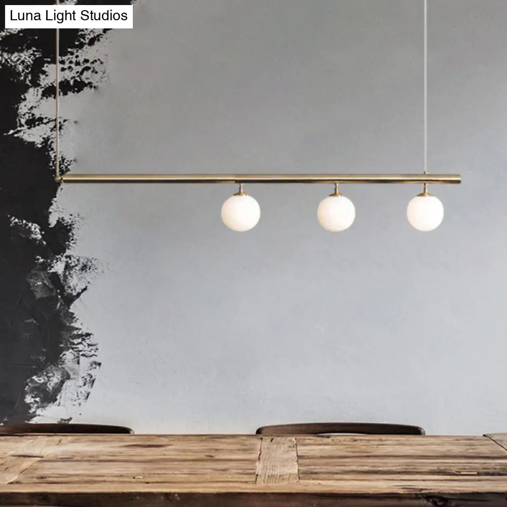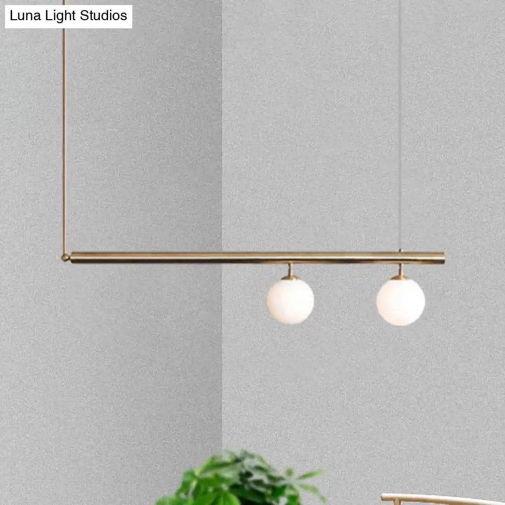 This is a ceiling light that is made to look modern. It has a linear design with a bubble shade. The light is gold in color and is made to hang in a dining room. It comes in two different sizes and has either 2 or 3 lights. The light is LED and G4 in bulb base.