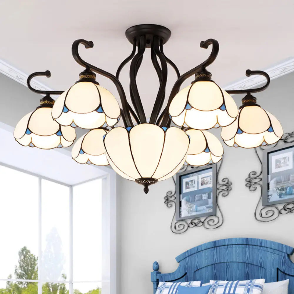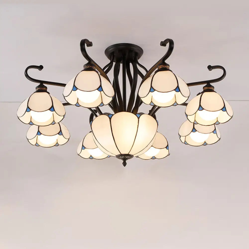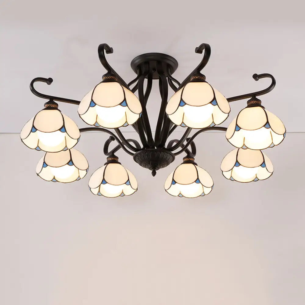 This gorgeous scalloped ceiling mount chandelier is a must-have for any home decor. It is designed with a Tiffany style and features stunning handcrafted stained glass featuring warm whites and blues that will bring a unique energy to your living room. The semi-flush mount style is great for short ceilings that still want to achieve the look of a full pendant light. This statement piece comes in multiple sizes, with a range of widths (27", 34.5", 38.5") and heights (19", 18", 19.5") to choose from so you can pick the perfect fit for your space. It also comes in a range of light quantities (3, 6, 7, 8, or 9 lights) so you can opt for a bolder or subtler look. The light type (LED, Incandescent, Fluorescent), bulb included (no), and the voltage (110V-120V, 220V-240V) options will make sure the fixture is properly outfitted for your particular needs. All the materials (glass) and the base of the bulbs (E26/E27) are top quality as well so you can rest assured that the lighting will be reliable and beautiful. With its timeless style and luxury design, this scalloped semi flush Tiffany chandelier is the perfect choice for living rooms and bedrooms.