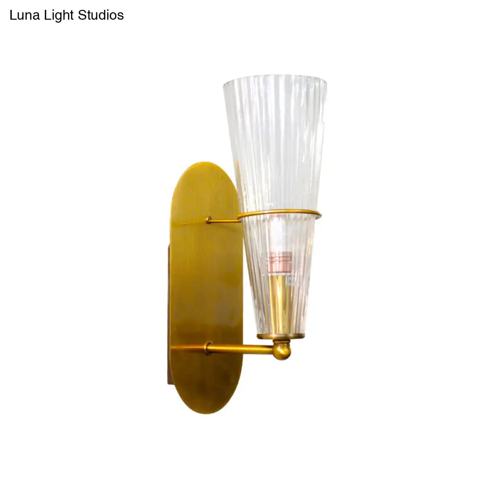 DecorBites™ Indoor Mid Century Modern Brass Cone Wall Sconce with Clear Ribbed Glass – Single Light