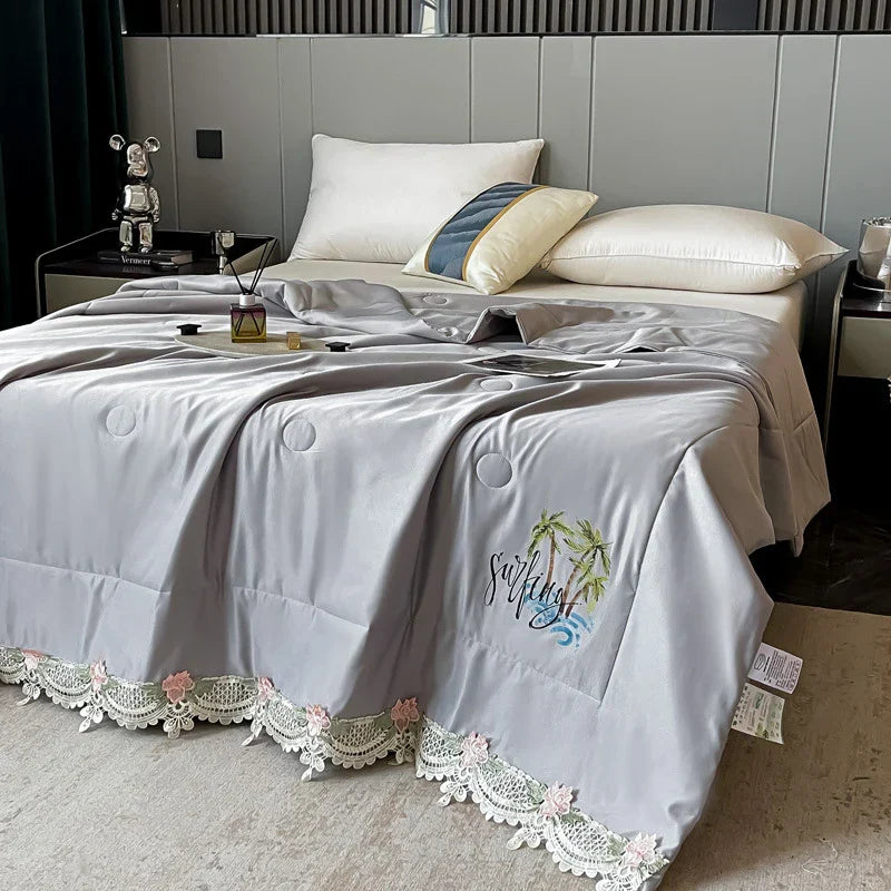 DecorBites™ Lace Edge Flowers Embroidery Cool Blanket for Bed - Machine Washable Summer Quilt