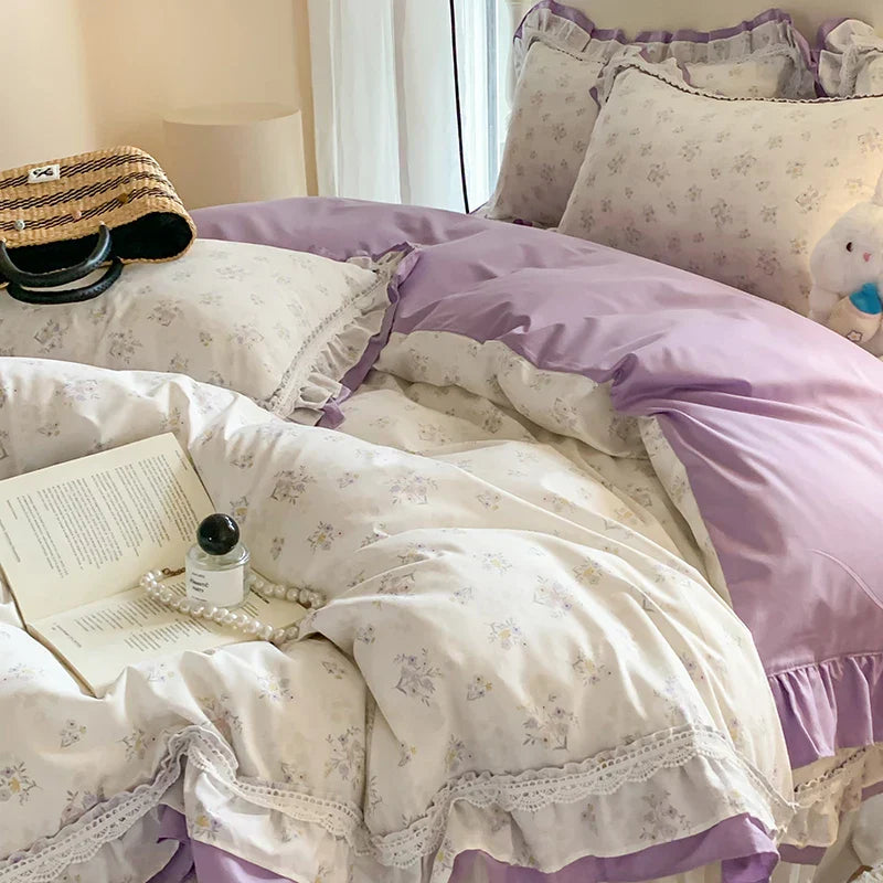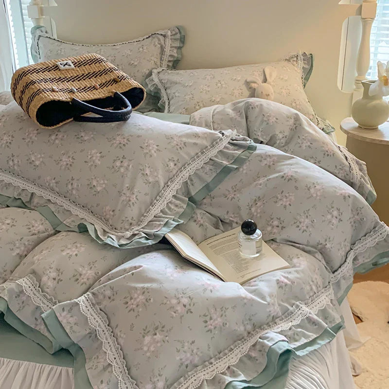 DecorBites™ Lace Ruffles Cotton Floral Duvet Set with Pillowcase, Princess Bedding