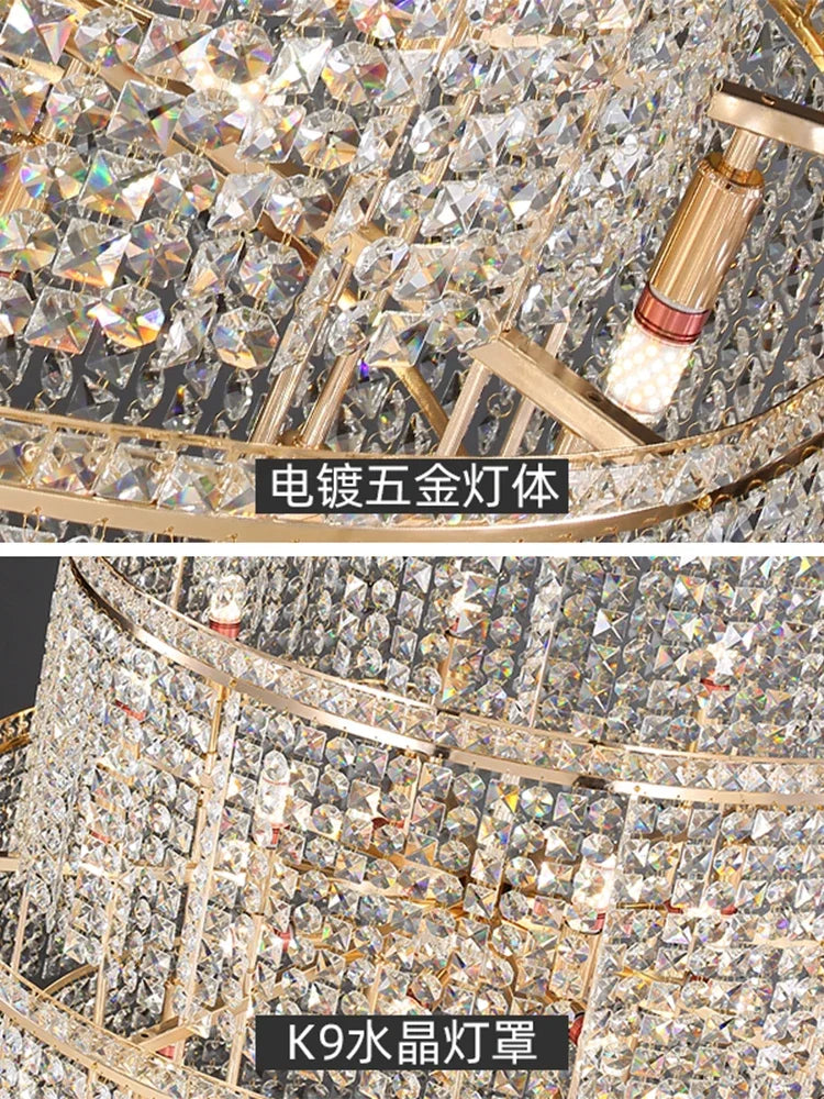 Introducing the Large Golden Crystal Chandelier, a stunning masterpiece that embodies modern luxury for high ceilings. This exquisite lighting fixture is designed to elevate the ambiance of any space, from grand parlors to cozy bedrooms and luxurious hotel halls.