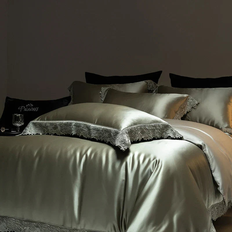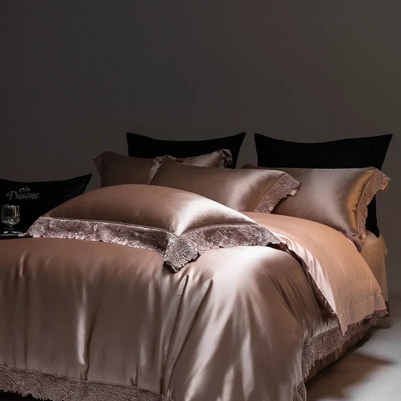 DecorBites™ Luxe French Lace Edge Bedding Set: Silky Lyocell Cotton Duvet Cover, Sheet & Pillowcases