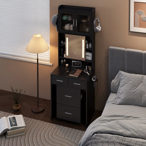 Transform your small space into a stylish and functional beauty station with this compact vanity desk set. Designed with space-saving features, it offers a clever combination of a sliding mirror, ample storage, and a comfortable stool, perfect for small bedrooms or apartments. The sleek, modern design is enhanced by adjustable LED lighting and built-in charging stations, making your daily routine more convenient and enjoyable. Whether you're prepping for the day or winding down at night, this vanity set offers everything you need to create a clutter-free, elegant beauty corner.