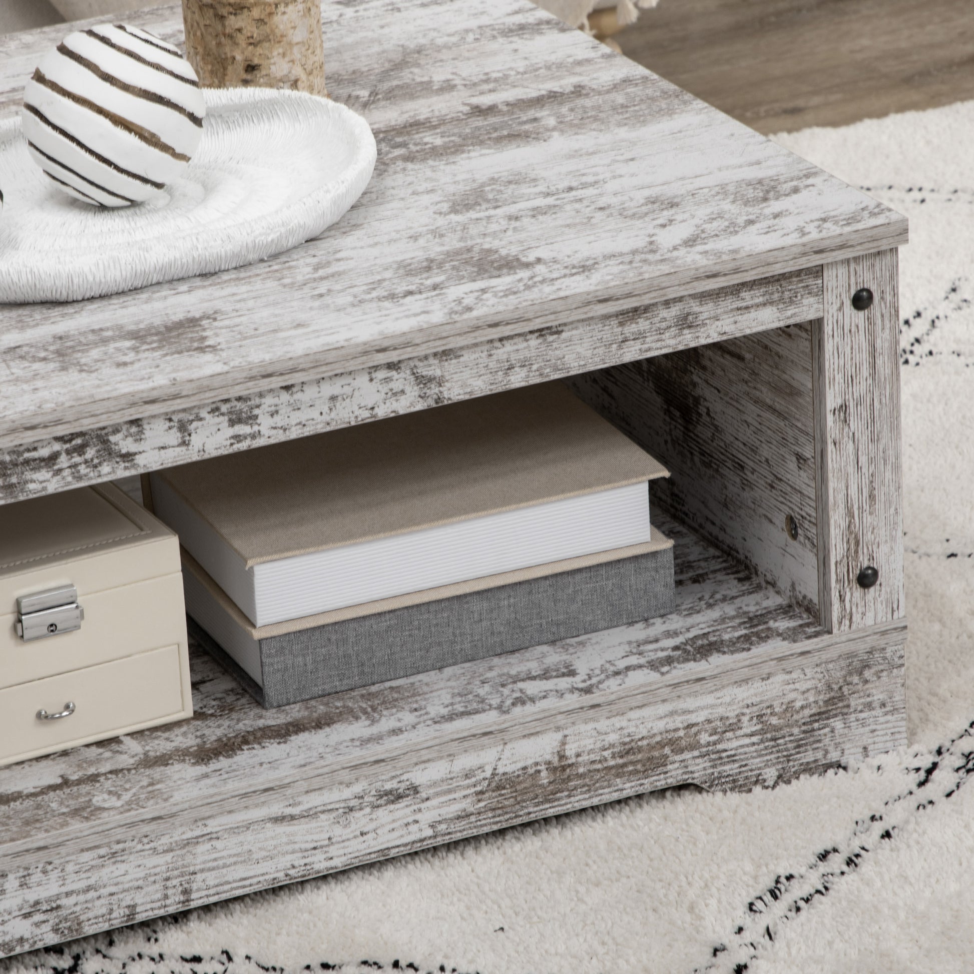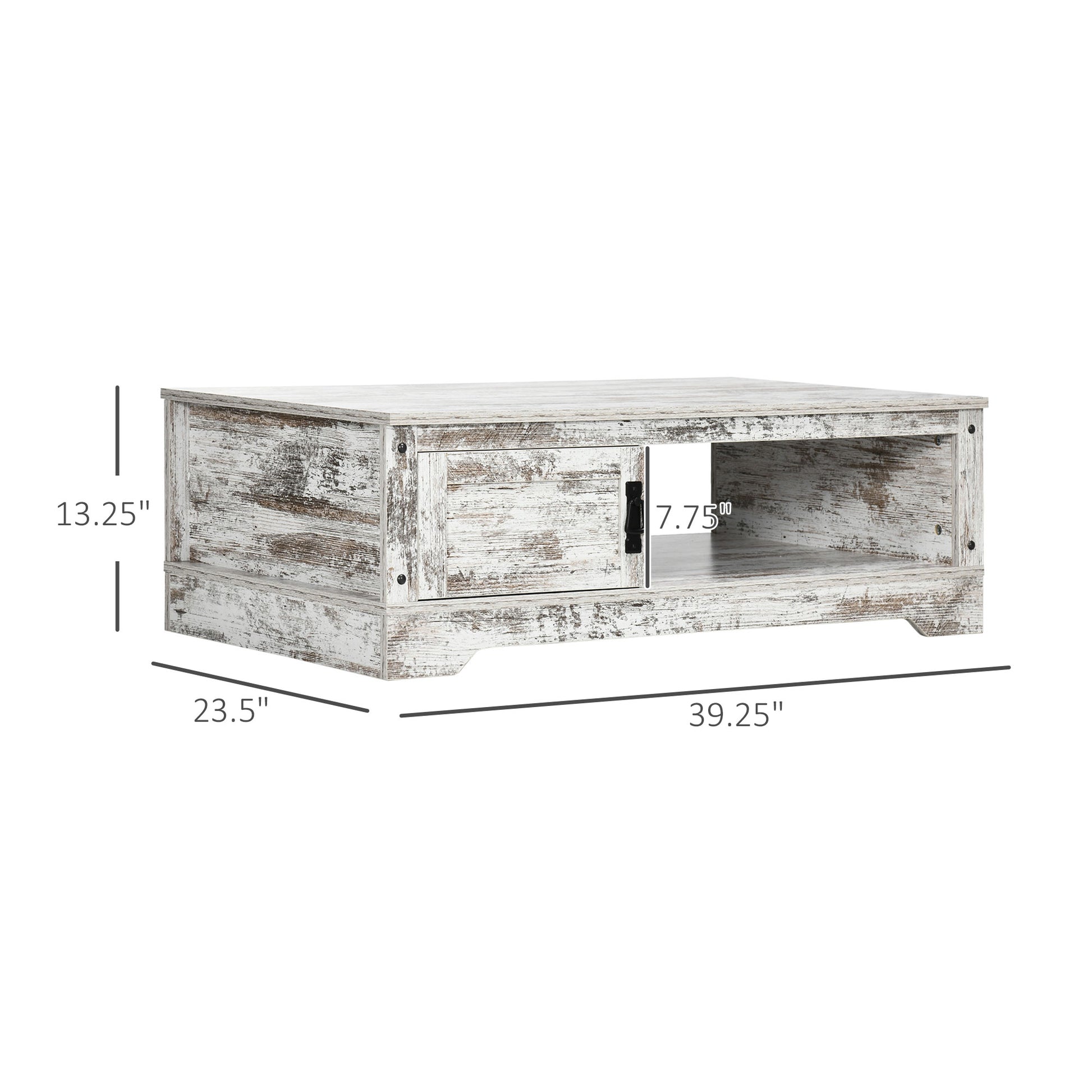 This vintage-style cocktail table offers rustic appeal, and features a half-open design for easy-access storage. With a look of distinguished charm and a build with high-stability construction, your space can be decorated with a raw-edge feel while benefiting from durability that can withstand heavy weights. The tea table features a spacious tabletop, compartments, and a cabinet for daily accessories and utensils. Make your house a home with HOMCOM. Features: - A large tabletop, cabinet, and shelf provide enough storage space for daily items - High-stability construction withstands up to 88 lbs. - Suitable for home office, study room, living room, and lounge areas - Melamine-coated wood makes for an easy-to-clean surface - Assembly required Specification: - Color: Brown - Material: Particleboard - Overall Dimensions: 39.4" W x 23.4" D x 13.2" H - Cabinet Inner Dimensions: 13.8" W x 10.6" D x 7.9" H - Compartment Dimensions (large): 21.7" W x 22.8" D x 7.9" H - Compartment Dimensions (small): 13.8" W x 8.3" D x 7.5" H - Weight Capacity: 88 lbs. (total), 11 lbs. (cabinet), 11 lbs. (small storage compartment), 22 lbs. (large storage compartment), 44 lbs. (table top) - Item Label: 839-471V00BN Package Includes: - 1 x Coffee Table - 1 x Manual This vintage-style cocktail table offers rustic appeal, and features a half-open design for easy-access storage. - Suitable for home office, study room, living room, and lounge areas - Melamine-coated wood makes for an easy-to-clean surface - Assembly required Specification: - Color: Washed Bark - Material: Particleboard - Overall Dimensions: 39.25" W x 23.5" D x 13.25" H - Cabinet Inner Dimensions: 13.75" W x 10.75" D x 7.75" H - Compartment Dimensions (large): 21.5" W x 23" D x 8" H - Compartment Dimensions (small): 14" W x 8.5" D x 7.5" H - Weight Capacity: 88 lbs. (table top) - Item Label: 839-471V00WT Package Includes: - 1 x Coffee Table - 1 x Manual.