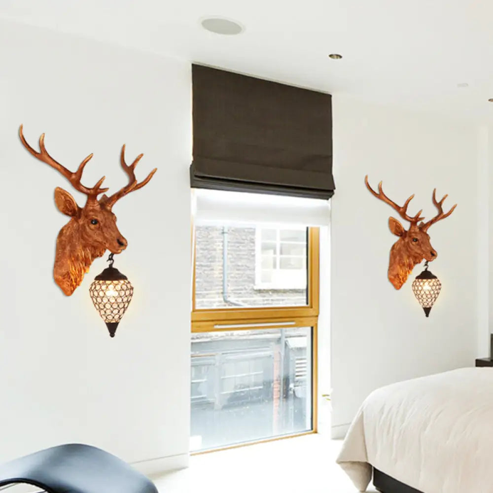 Country Crystal Wall Sconce Lamp with Deer Head, Teardrop Beveled Design - 15"/20.5"/24.5" Wide, 1 Head, White/Yellow/Gold